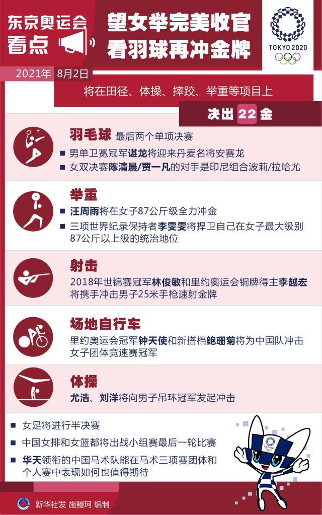 新華社東京8月1日電(記者王恒志 王沁鷗)東京奧運會羽毛球項目將于2日收官,中國隊將在最后兩個單項決賽中繼續沖金。當日收官的還有中國舉重隊,在女舉最后兩個單項上,汪周雨攜手李雯雯將向冠軍發起沖擊。此外在射擊、場地自行車等項目上中國隊也要力爭獎牌,中國女排和女籃則將分別出戰小組賽最后一輪。 中國羽毛球隊在東京奧運會上的表現令人驚喜,五個單項全部打進決賽。2日最后兩個單項決賽中,男單衛冕冠軍諶龍將迎來與丹麥名將安賽龍的“雙龍會”,這也是里約奧運會半決賽的重演;女雙決賽陳清晨/賈一凡的對手是印尼組合波莉/拉哈尤。 中國舉重隊在本屆奧運會上的表現極為出色,已經出戰的六位選手拿下五金一銀,汪周雨和李雯雯期待在2日的比賽中為中國隊送上完美謝幕戰,其中汪周雨將在女子87公斤級全力沖金,三項世界紀錄保持者李雯雯則將捍衛自己在女子最大級別87公斤以上級的統治地位。 射擊項目同樣將迎來收官戰,已經為中國軍團貢獻三金一銀五銅的中國射擊隊將繼續出擊,2018年世錦賽冠軍林俊敏和里約奧運會銅牌得主李越宏將攜手沖擊男子25米手槍速射金牌。 場地自行車項目2日開賽,里約奧運會冠軍鐘天使和新搭檔鮑珊菊將為中國隊沖擊女子團體競速賽冠軍。體操項目尤浩、劉洋將向男子吊環冠軍發起沖擊。 東京奧運會2日將在田徑、體操、摔跤、舉重等項目上決出22金。女足將進行半決賽,美國隊迎戰加拿大,澳大利亞對陣瑞典;中國女排和女籃都將出戰小組賽最后一輪比賽;華天領銜的中國馬術隊能在馬術三項賽團體和個人賽中表現如何也值得期待。 |