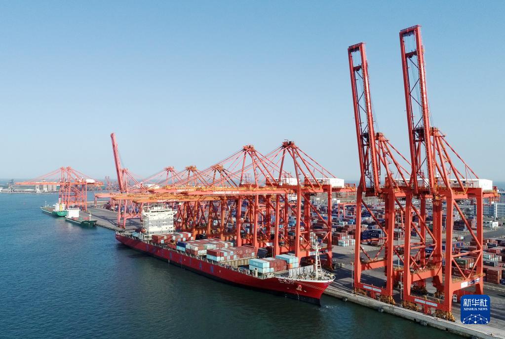 一艘輪船靠泊在唐山港京唐港區集裝箱碼頭裝貨(4月8日攝,無人機照片)。新華社記者 楊世堯 攝