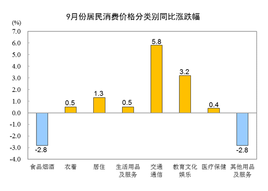 9月份,食品煙酒類價格同比下降2.8%,影響CPI(居民消費價格指數)下降約0.79個百分點。食品中,畜肉類價格下降28.5%,影響CPI下降約1.26個百分點,其中豬肉價格下降46.9%,影響CPI下降約1.12個百分點;鮮菜價格下降2.5%,影響CPI下降約0.05個百分點;鮮果價格下降0.8%,影響CPI下降約0.01個百分點;蛋類價格上漲12.6%,影響CPI上漲約0.08個百分點;水產品價格上漲9.8%,影響CPI上漲約0.18個百分點;糧食價格上漲0.7%,影響CPI上漲約0.01個百分點。