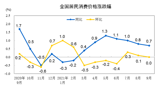 原標題:2021年9月份居民消費價格同比上漲0.7% 環比持平
