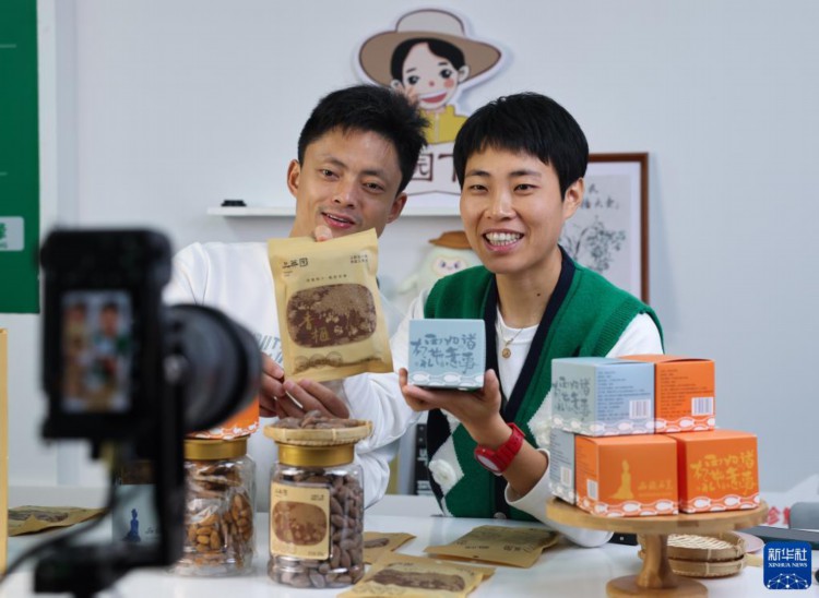 11月12日,浙江省諸暨市東白湖鎮上英村黨總支書記趙堅均、黨員志愿者莊園(右)在“上英園夢”共富工坊直播間銷售香榧。