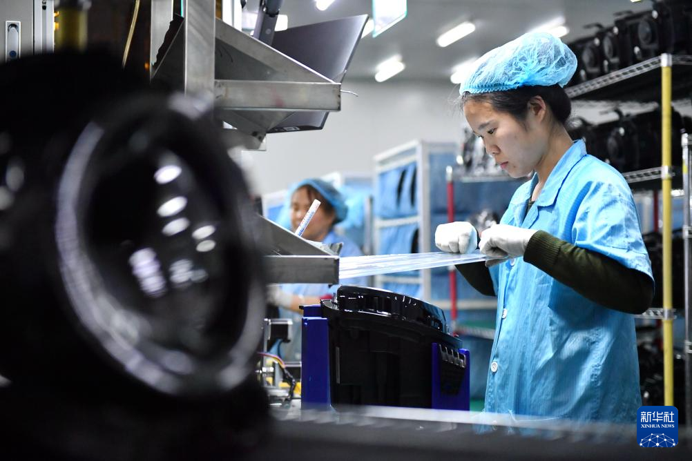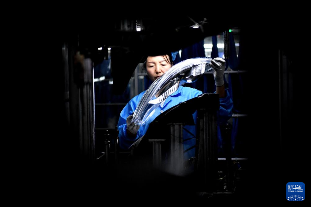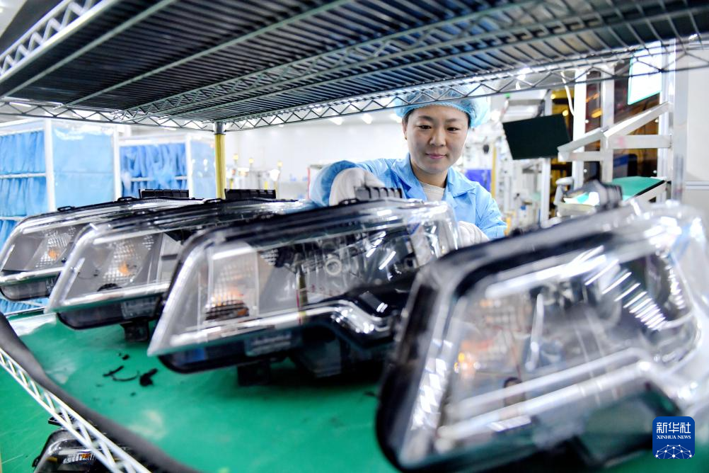 3月25日,工作人員在阜城縣一家汽車配件生產企業的生產車間整理汽車前組合燈。