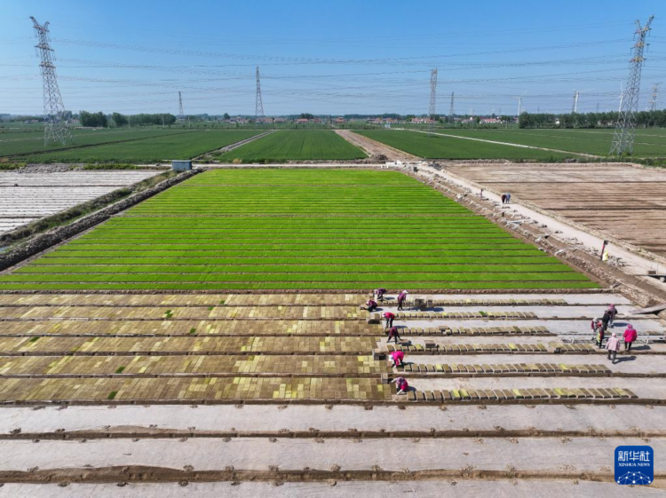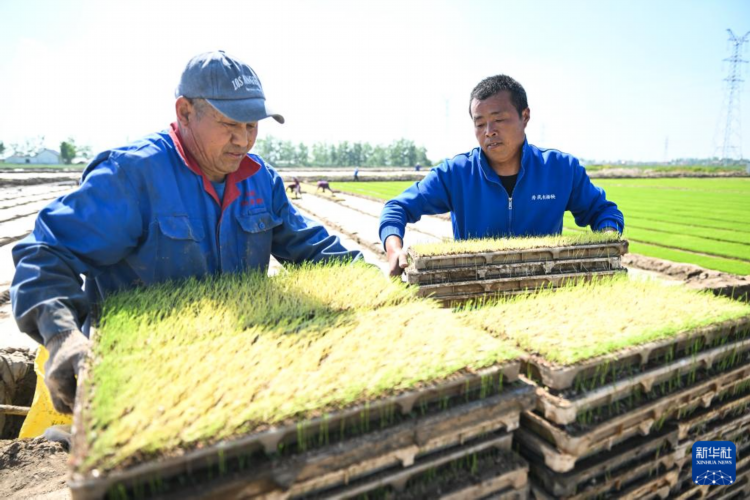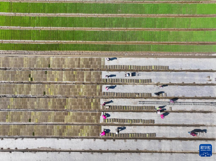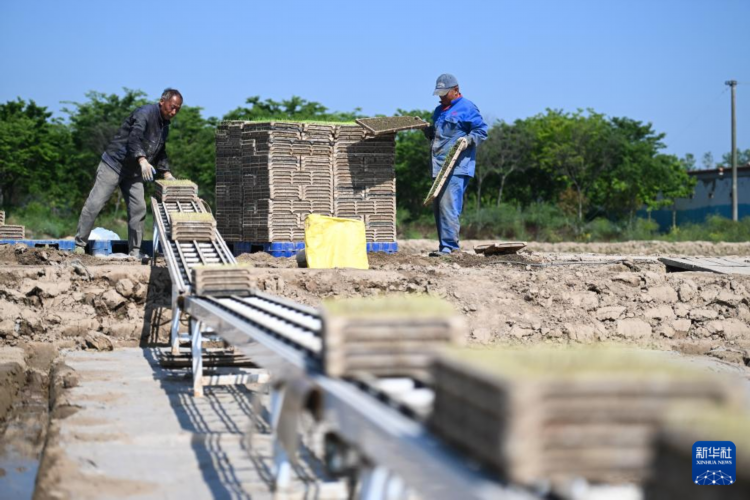 5月8日,射陽縣為民農機合作社農民在秧池旁搬運秧盤。
