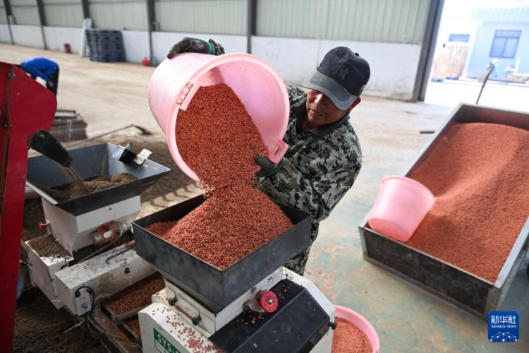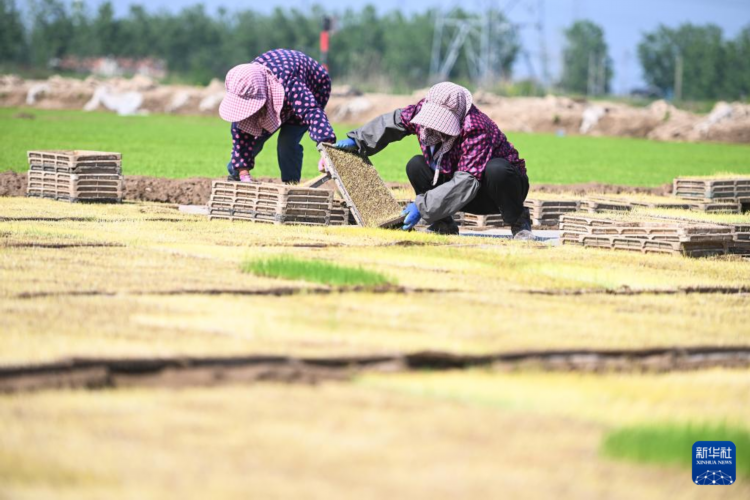 5月8日,射陽縣為民農機合作社農民在育秧生產線上添加稻種。