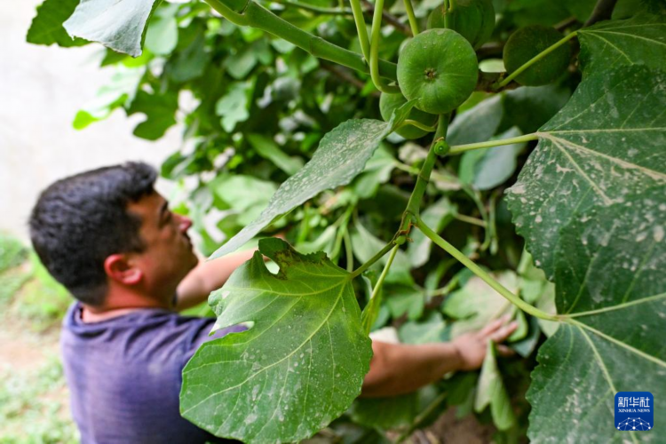 6月4日,新疆和田縣拉依喀鄉夏普吐魯艾日克村村民在自家果園查看無花果樹的掛果情況。