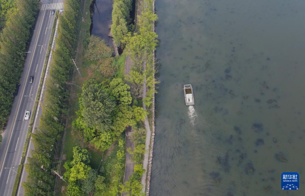 一艘清潔船航行在毗鄰G318國道的淀山湖上(8月8日攝,無人機照片)。