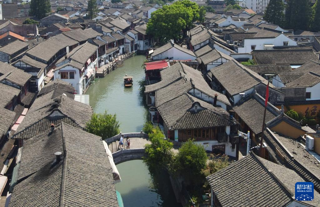在上海青浦朱家角古鎮,游客從一座通行游覽船的河道石橋上走過(8月9日攝,無人機照片)。