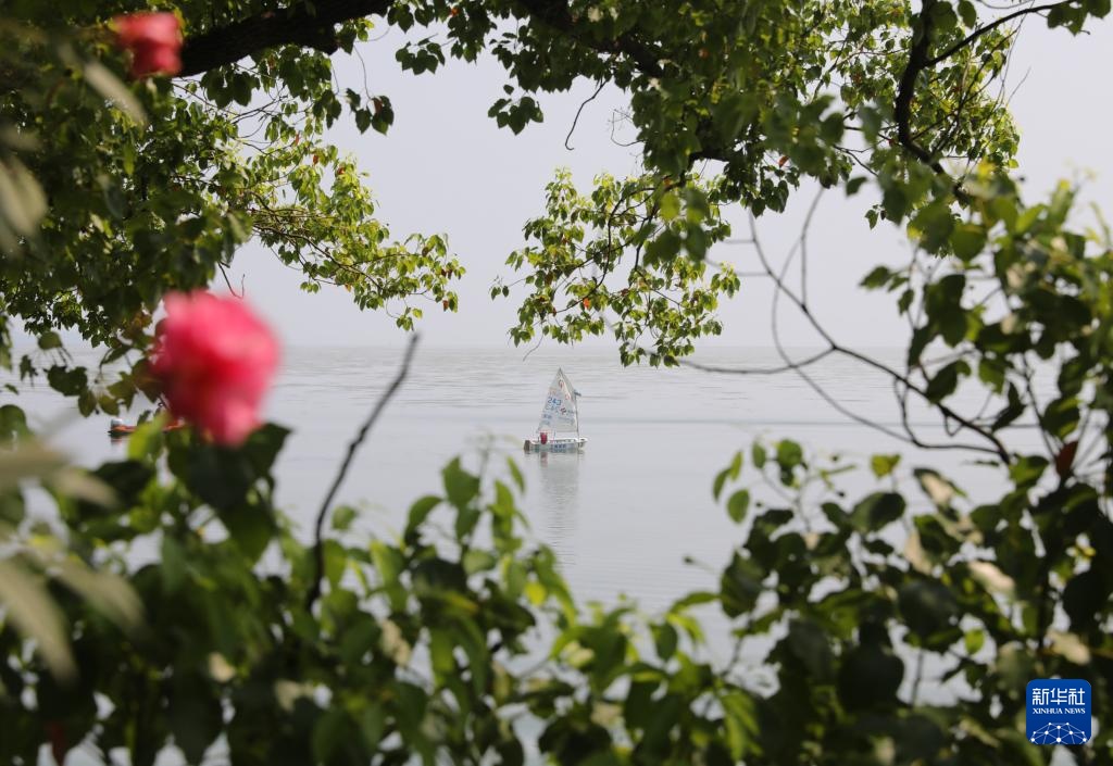 一艘訓練中的帆船航行在上海青浦淀山湖上(8月8日攝)。