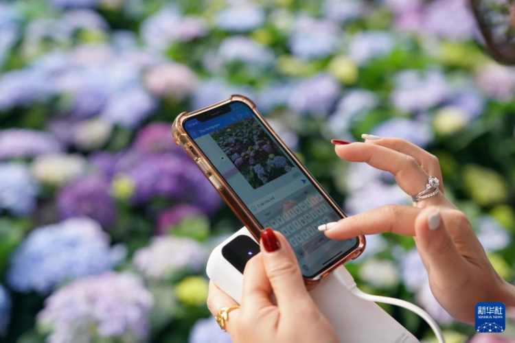 4月11日,越南花商阮翠云在中國云南昆明斗南一花卉基地內將拍攝的繡球花圖片發給客戶。