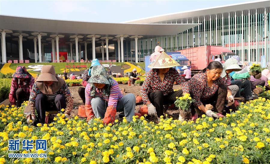 10月21日,工人們在國家會展中心(上海)南廣場布置進博會鮮花裝飾。 當日,第二屆中國國際進口博覽會國家展參展國名單公布。據悉,國家展總面積3萬平方米(建筑面積),將有來自世界各地60余個國家和3個國際組織搭建展臺,展示貿易投資領域的發(fā)展狀況和成就。目前,進博會場館裝飾施工工作正在進行,國家會展中心(上海)將以全新面貌迎接各國嘉賓的到來。 新華社記者 方喆 攝