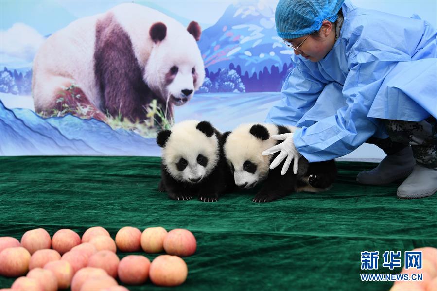 11月11日,秦嶺大熊貓龍鳳胎“佳佳”“園園”在陜西省林業科學院秦嶺大熊貓繁育研究中心亮相。 新華社記者 李一博 攝 |