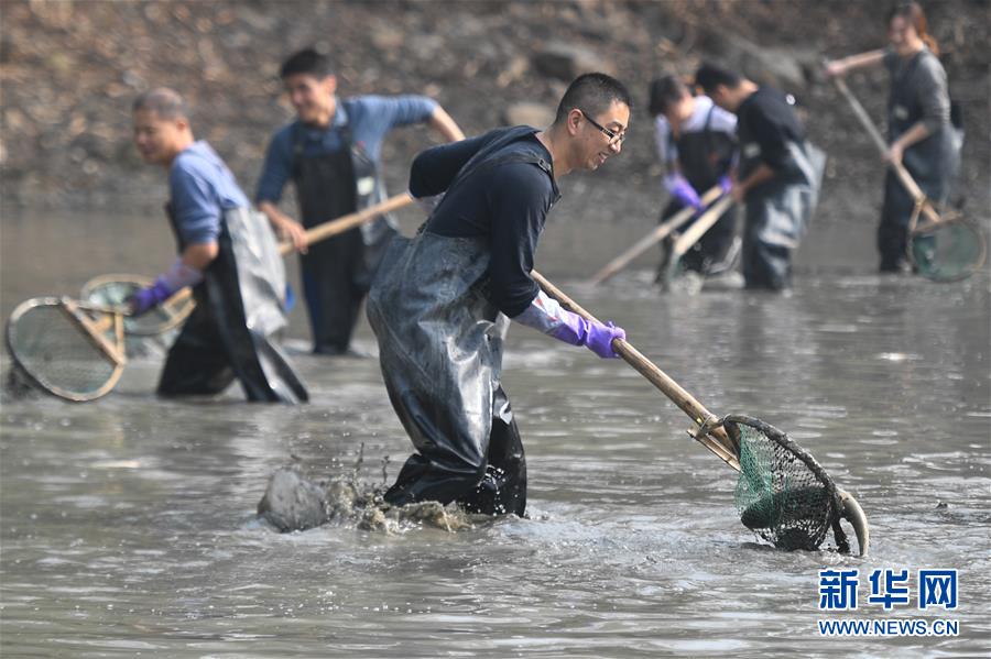 11月24日,游客在西溪濕地體驗“干塘”捕魚。 近日在杭州西溪國家濕地公園,漁夫們抽掉塘水清理淤泥,一批游客借用漁夫們的下水褲,體驗“干塘”捕魚。 “干塘”是杭州西溪一帶村民的傳統生產習俗,漁戶在冬季將魚塘內的水抽掉,清挖淤泥,以便第二年可以更好地養魚。 新華社記者 黃宗治 攝