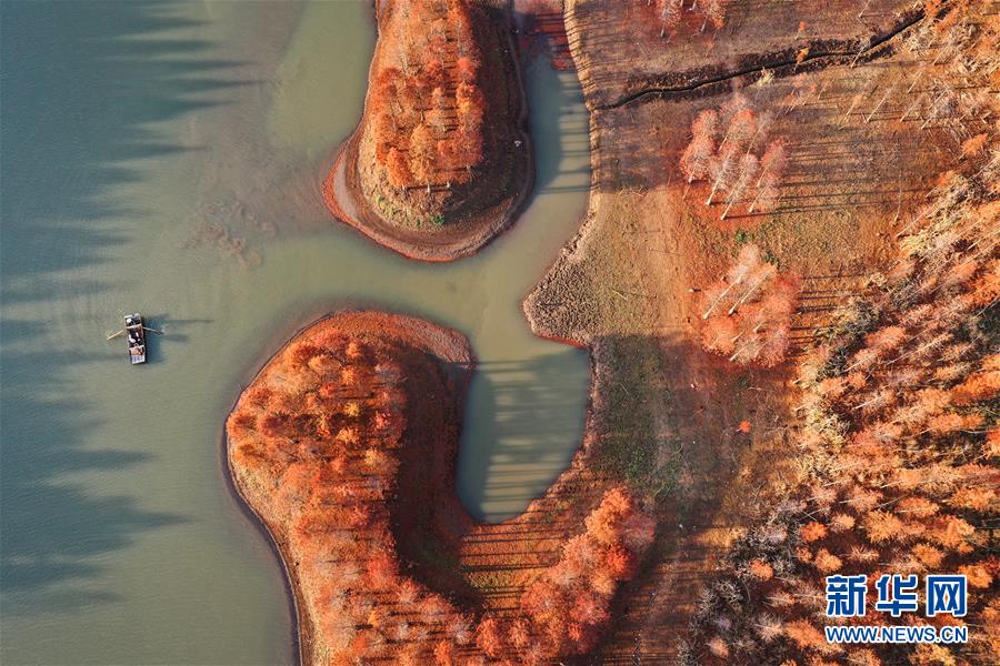 11月28日,一艘小船駛過天泉湖畔的紅杉林(無人機拍攝)。 新華社記者 楊磊 攝