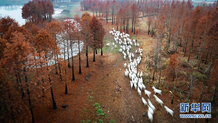 11月27日,牧歸的羊群行走在紅杉林中(無人機拍攝)。 初冬之際,在江蘇盱眙天泉湖畔,連片的紅杉呈現鮮艷的色彩,構成獨特的景觀畫卷。天泉湖在生態建設時種植紅杉,目前已成為有名的生態旅游目的地。 新華社記者 楊磊 攝