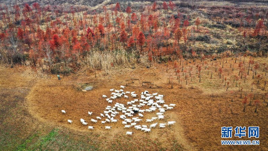 11月27日,牧歸的羊群行走在紅杉林中(無人機拍攝)。初冬之際,在江蘇盱眙天泉湖畔,連片的紅杉呈現鮮艷的色彩,構成獨特的景觀畫卷。天泉湖在生態建設時種植紅杉,目前已成為有名的生態旅游目的地。新華社記者 楊磊 攝
