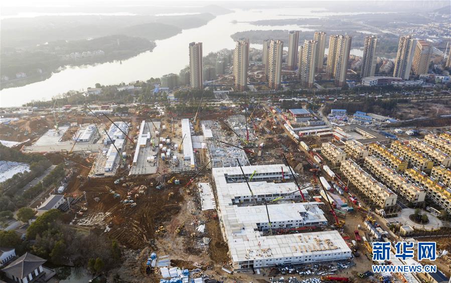 截至1月30日中午12時,武漢火神山醫院項目場地平整、砂石回填、HDPE膜鋪設全部完成,集裝箱板房進場、改裝、現場吊裝等施工快速推進。 新華社記者 才揚 攝