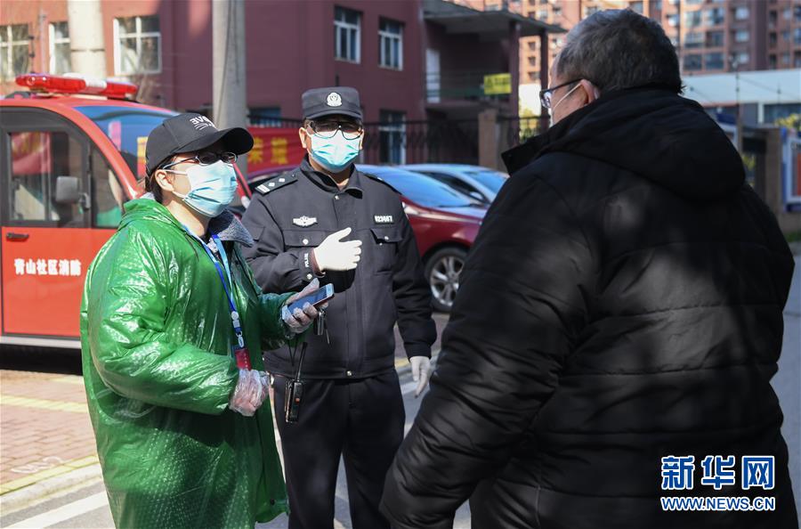 2月18日,青山區工人村街道青和居社區黨總支書記桂小妹(左)勸阻準備出門的居民回家。新華社記者 程敏 攝