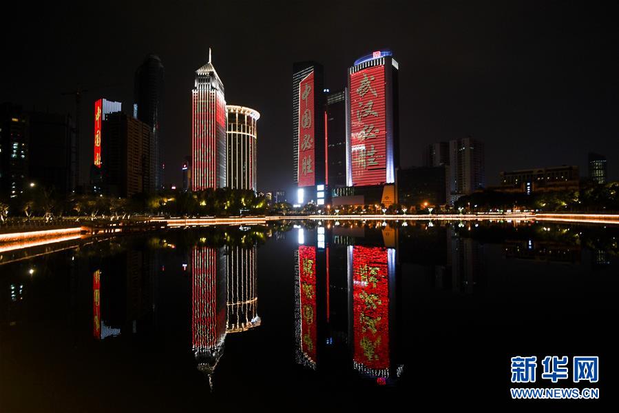這是3月15日晚拍攝的武漢市江漢區西北湖附近高層建筑外墻打出“武漢必勝”“中國必勝”字樣。 夜幕降臨,湖北武漢不少建筑點亮了景觀燈,為武漢加油。 新華社記者 陳曄華 攝