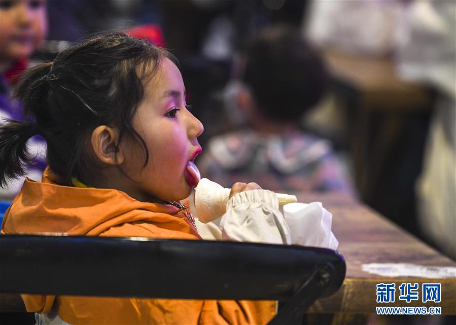 3月16日,在和田夜市環湖店,一個小朋友在品嘗美食。新華社記者 趙戈 攝