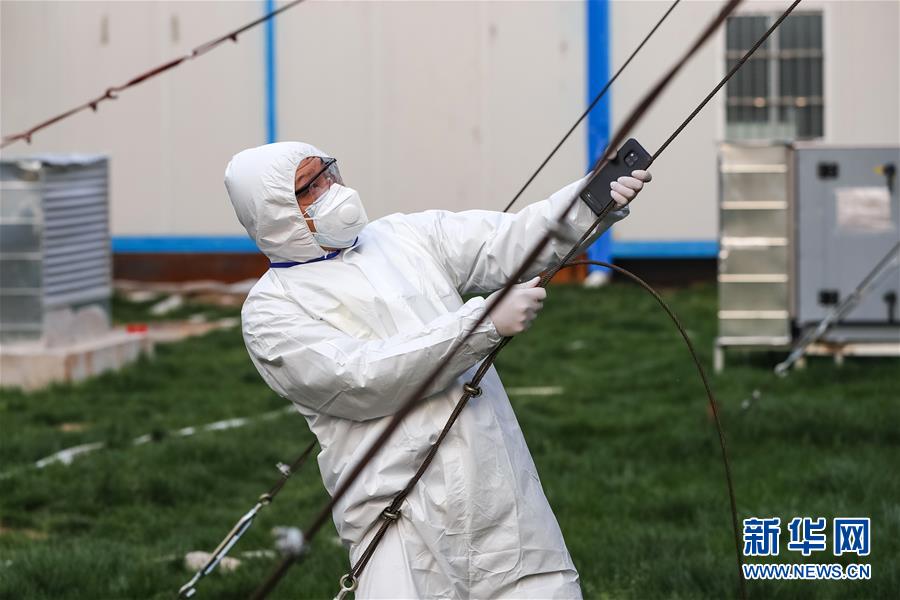 3月31日,中建三局項(xiàng)目經(jīng)理尹典在武漢火神山醫(yī)院檢查連接重癥病房的排風(fēng)管的穩(wěn)固性。 新華社記者 沈伯韓 攝 |