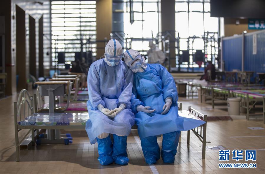 這是3月10日,在武昌方艙醫(yī)院,兩位青海醫(yī)療隊隊員在等待新冠肺炎治愈患者出艙時小憩。 新華社記者 費茂華 攝