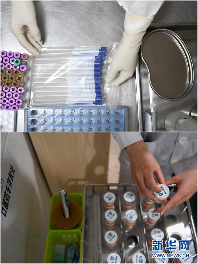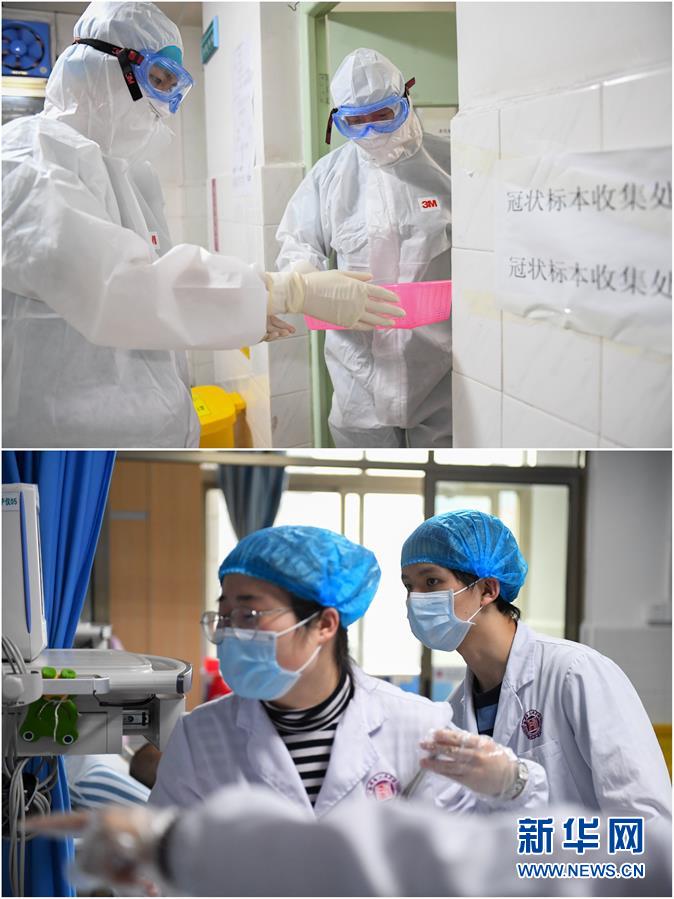 拼版照片:上圖為2月7日,易俊豐(左)在湖南省人民醫院發熱門診接診區將咽拭子交給醫生;下圖為4月22日,易俊豐(右)在湖南省人民醫院神內一科重癥監護室與醫生檢查患者用藥情況。 新華社記者 陳澤國 攝