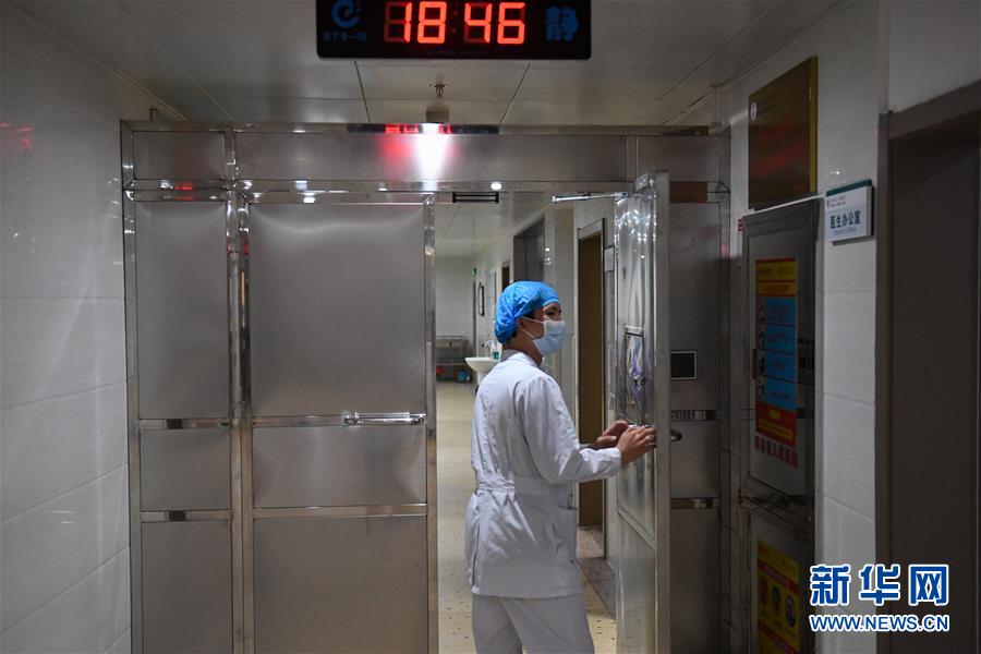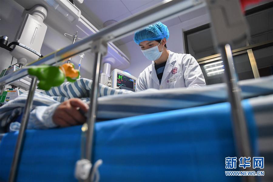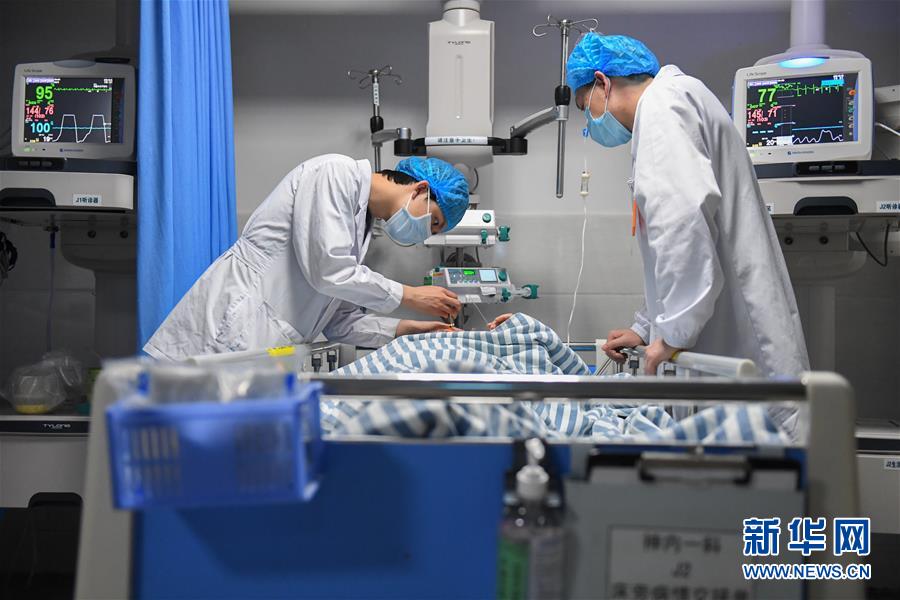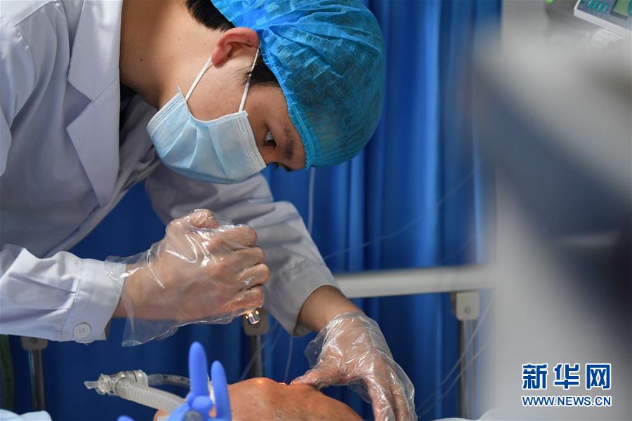 易俊豐在湖南省人民醫院神內一科重癥監護室觀察病人瞳孔(4月22日攝)。 新華社記者 陳澤國 攝