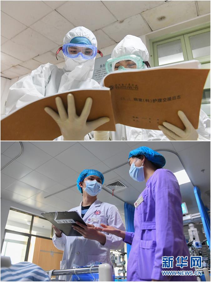 拼版照片:上圖為2月7日,易俊豐(左)在湖南省人民醫院發熱門診與夜班護士曹穎交接工作;下圖為4月22日,易俊豐(左)在湖南省人民醫院神內一科重癥監護室與白班護士黃飛交接工作。新華社記者 陳澤國 攝