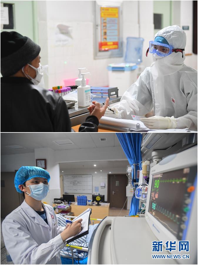 拼版照片:上圖為2月7日,易俊豐(右)在湖南省人民醫院發熱門診接診區初步詢問病人情況并做記錄;下圖為4月22日,易俊豐在湖南省人民醫院神內一科重癥監護室記錄病人生命體征數據。 新華社記者 陳澤國 攝