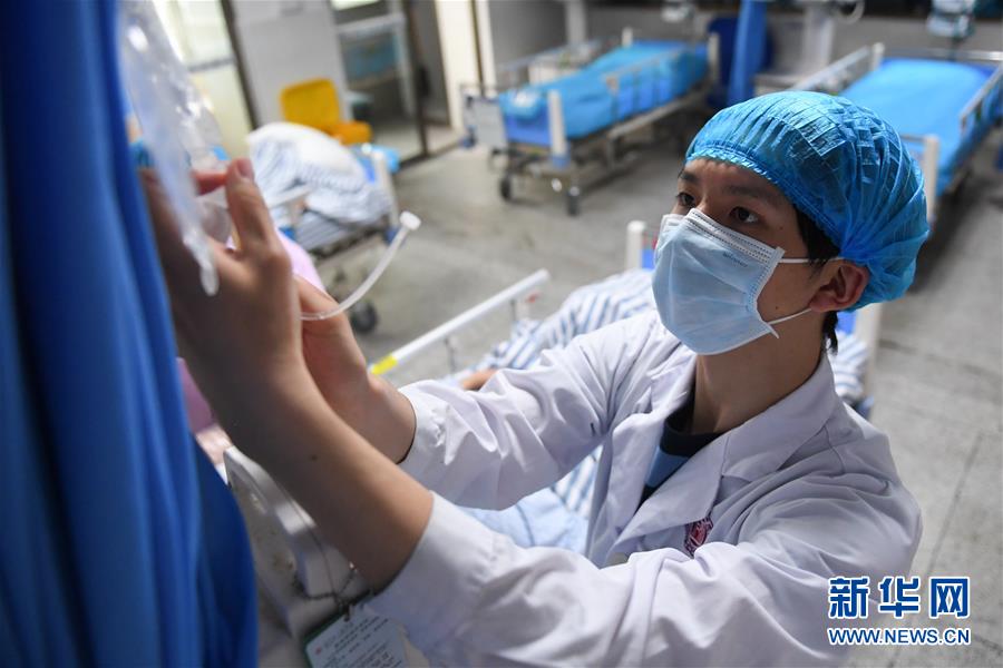 易俊豐在湖南省人民醫院神內一科重癥監護室為病人更換輸液藥品(4月22日攝)。 新華社記者 陳澤國 攝
