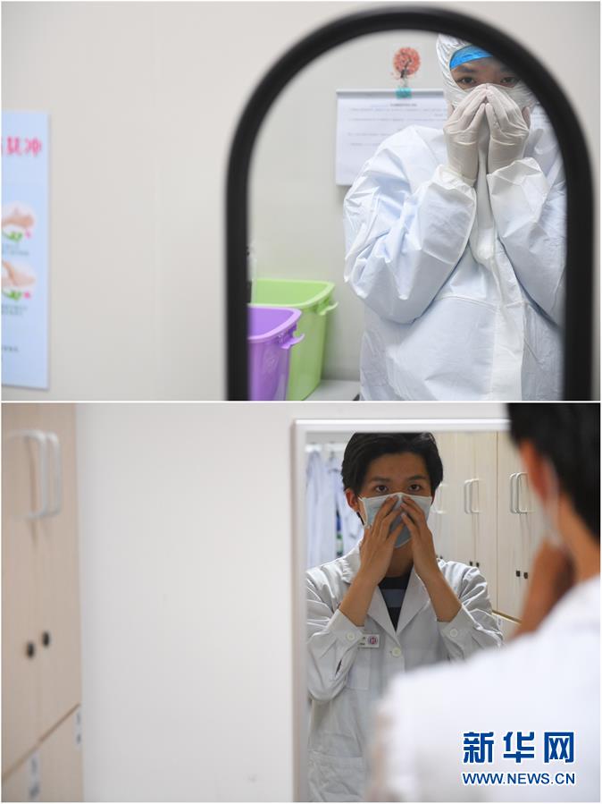 拼版照片:上圖為2月6日,易俊豐在湖南省人民醫院發熱門診更衣區佩戴口罩后檢查氣密性;下圖為4月22日,易俊豐在湖南省人民醫院神內一科更衣區佩戴口罩。 新華社記者 陳澤國 攝
