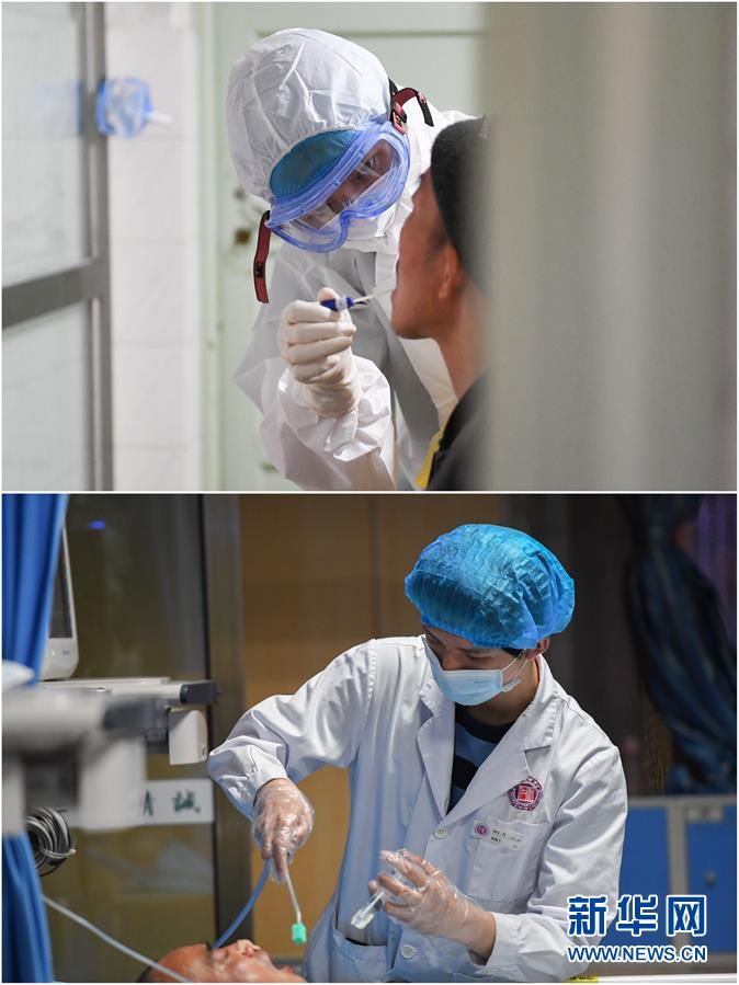 拼版照片:上圖為2月7日,易俊豐(左)在湖南省人民醫院發熱門診接診區取咽拭子標本;下圖為4月22日,易俊豐在湖南省人民醫院神內一科重癥監護室為病人做口腔護理。 新華社記者 陳澤國 攝