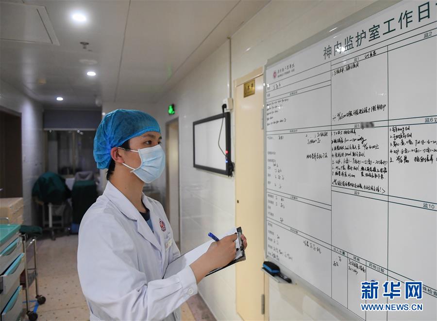 易俊豐在湖南省人民醫院神內一科重癥監護室查看病人用藥記錄(4月22日攝)。 新華社記者 陳澤國 攝
