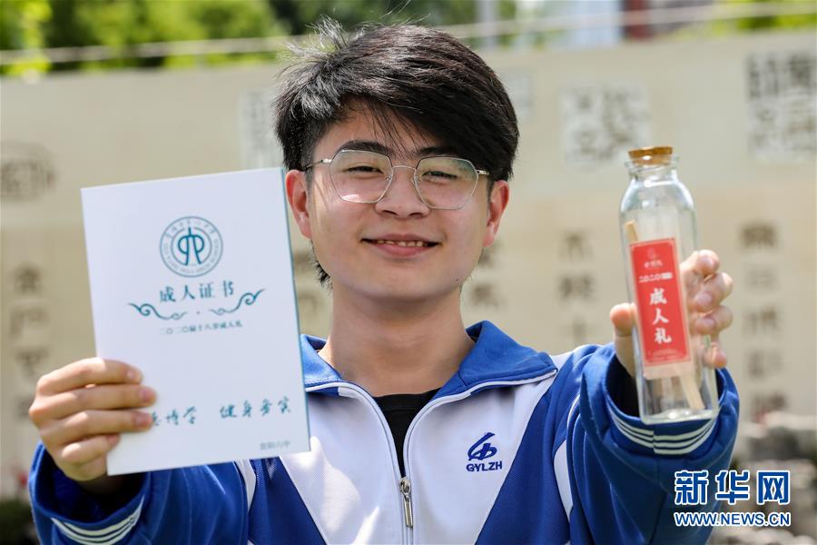 5月5日,貴陽市第六中學高三學生展示成人證書和記錄自己心愿的“初心瓶”。新華社記者 歐東衢 攝