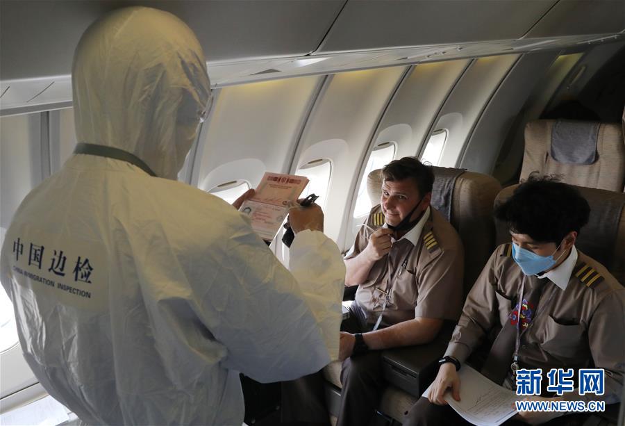 5月12日,搭載61噸抗疫物資的韓亞航空公司航班從山東煙臺飛往美國洛杉磯,這是煙臺機場出入境邊防檢查站民警在核對機組人員信息。 為保障抗疫物資快速通關,煙臺機場出入境邊防檢查站優(yōu)化貨運出入境查驗流程,施行“全時段、全天候、零等待”的通關保障,平均每架次節(jié)省40分鐘通關時間。 新華社記者 朱崢 攝