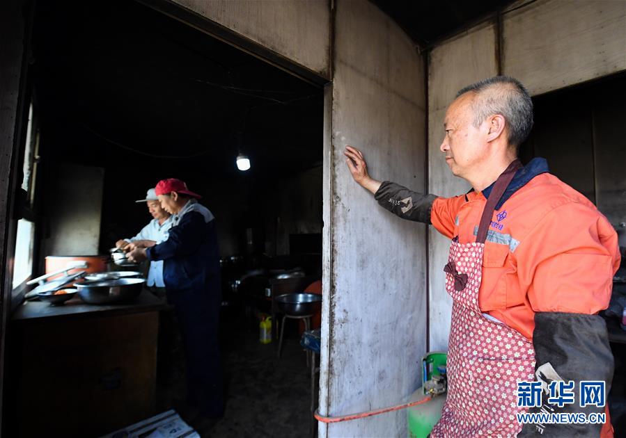 營地廚師楊云明在一旁看工友們?nèi)〔停?月16日攝)。因為營地僅有一個廚師,來自四川的楊云明自開工以來一直工作生活在營地里。 新華社記者 宋彥樺 攝