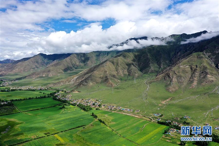 拉薩市林周縣邊交林鄉田園景色(7月14日攝,無人機照片)。 林周縣地處西藏中部,拉薩河上游。夏日時節,這里水草豐茂,綠意盎然,河流、村落、農田組成一幅美麗的田園畫卷。 新華社記者 詹彥 攝