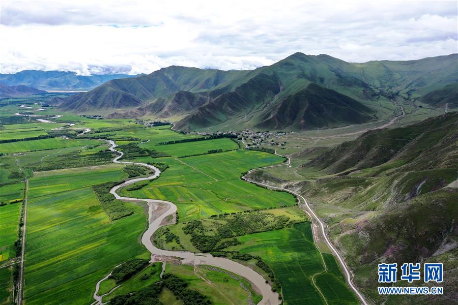拉薩市林周縣江熱夏鄉田園景色(7月14日攝,無人機照片)。 林周縣地處西藏中部,拉薩河上游。夏日時節,這里水草豐茂,綠意盎然,河流、村落、農田組成一幅美麗的田園畫卷。 新華社記者 詹彥 攝