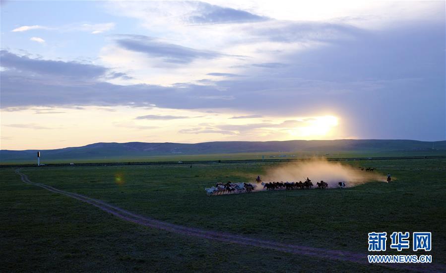 在內(nèi)蒙古錫林郭勒盟錫林浩特市鳳凰馬場拍攝的暮歸的馬群(6月26日攝)。 夏日,內(nèi)蒙古廣袤的大草原碧草連天,美景如畫。 新華社記者 賈立君 攝 |