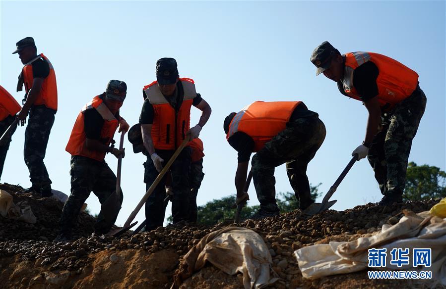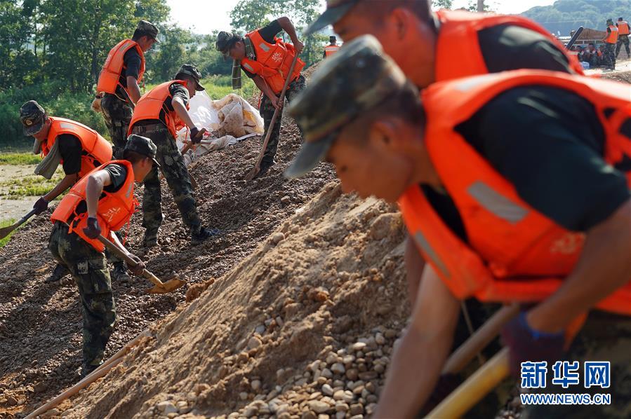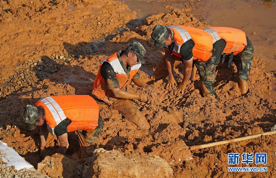 武警江西總隊上饒支隊的官兵在處置一處堤壩坍塌險情(7月14日攝)。 開挖導(dǎo)滲溝、填埋沙石、疏通排水渠、壘填沙袋,汗水劃過臉頰,浸濕軍裝。在位于江西省余干縣古埠鎮(zhèn)的齊埠聯(lián)圩上,武警江西總隊上饒支隊的60名戰(zhàn)士頭頂烈日,揮汗如雨,在泥水中處置一處堤壩坍塌險情。在這群平均年齡只有21歲的年輕戰(zhàn)士中,最小的只有18歲,其中“00”后戰(zhàn)士就有27人。在汗水與泥水的交織中,記者用鏡頭記錄下這些最可愛的身影。 新華社記者 萬象 攝