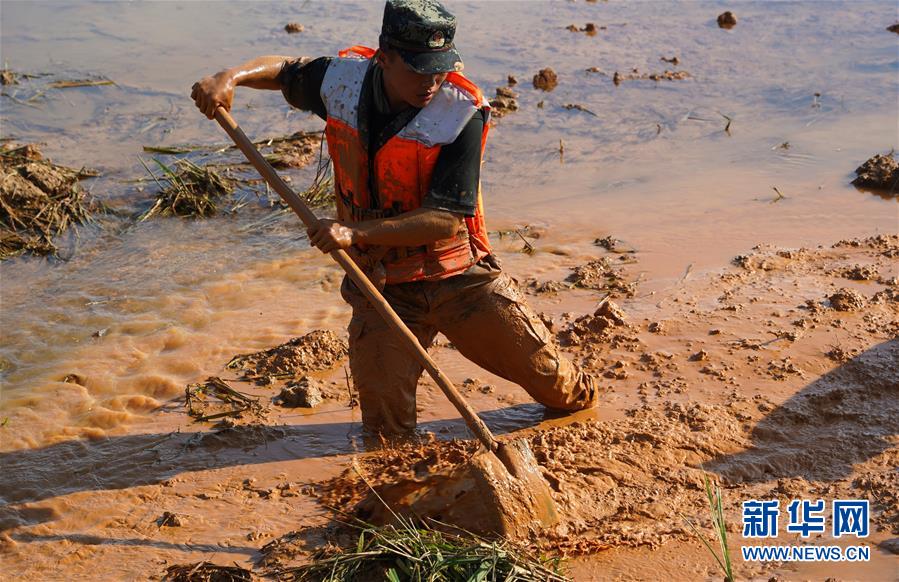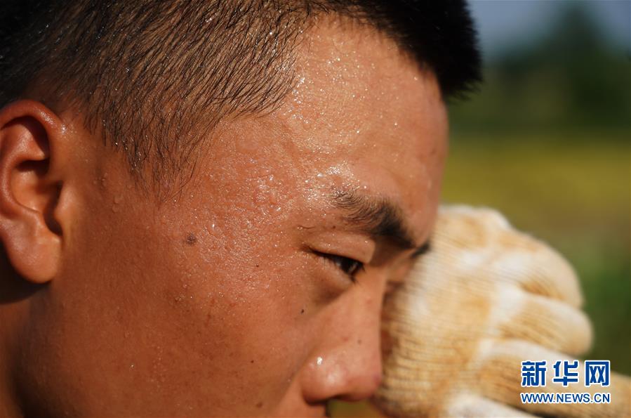 武警江西總隊上饒支隊的一名戰(zhàn)士在擦拭臉上的汗水(7月14日攝)。 開挖導(dǎo)滲溝、填埋沙石、疏通排水渠、壘填沙袋,汗水劃過臉頰,浸濕軍裝。在位于江西省余干縣古埠鎮(zhèn)的齊埠聯(lián)圩上,武警江西總隊上饒支隊的60名戰(zhàn)士頭頂烈日,揮汗如雨,在泥水中處置一處堤壩坍塌險情。在這群平均年齡只有21歲的年輕戰(zhàn)士中,最小的只有18歲,其中“00”后戰(zhàn)士就有27人。在汗水與泥水的交織中,記者用鏡頭記錄下這些最可愛的身影。 新華社記者 萬象 攝