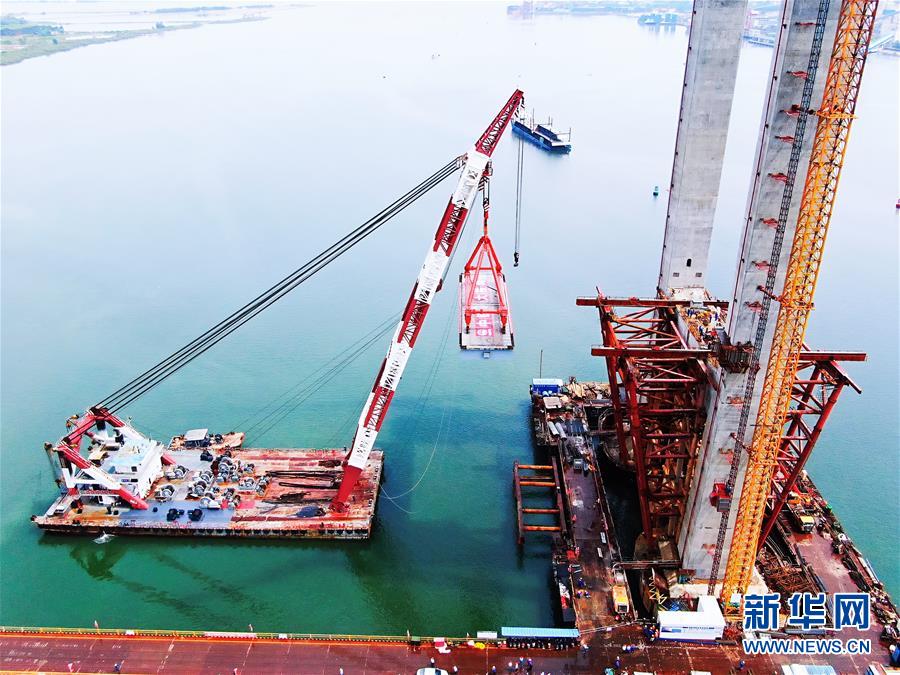 這是5月29日拍攝的廣東湛江調順跨海大橋施工現場(無人機照片)。 新華社記者 盧燁 攝