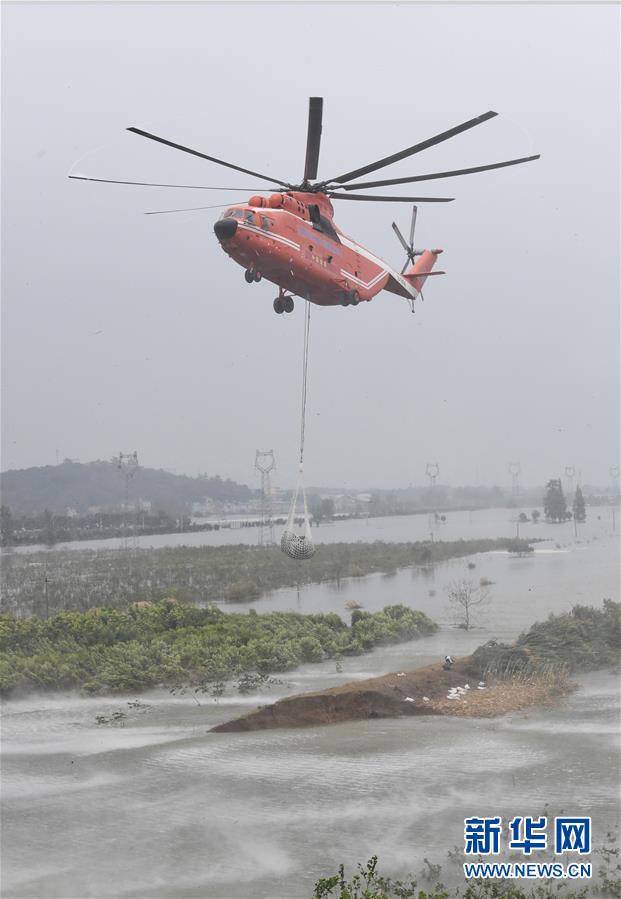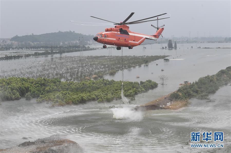7月16日,直升機在空投網兜石塊。 當日,湖北省應急管理廳緊急調度3架直升機,在湖北省陽新縣進行“水陸空”立體化應急救援。其中包括一架米-26直升機和一架米-171直升機在富河干堤葵賽湖下垸潰口上空,空投網兜石塊,另有一架指揮直升機。 7月9日,湖北省陽新縣富河干堤葵賽湖段下垸出現一處潰口。潰口處通往附近106國道的現有道路長約2公里,其中1公里為河堤,路面窄、路基軟,大型機械設備和工程車輛無法抵達,搶險施工難度較大。為了盡快完成封堵,湖北省應急管理廳緊急調度3架直升機,參與空投封堵。 新華社記者 程敏 攝
