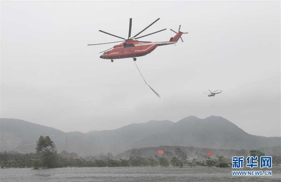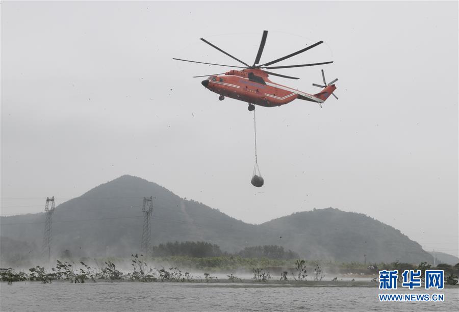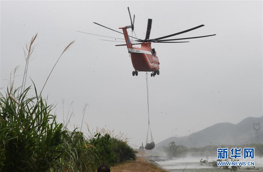 7月16日,直升機在空投網兜石塊。 新華社記者 程敏 攝