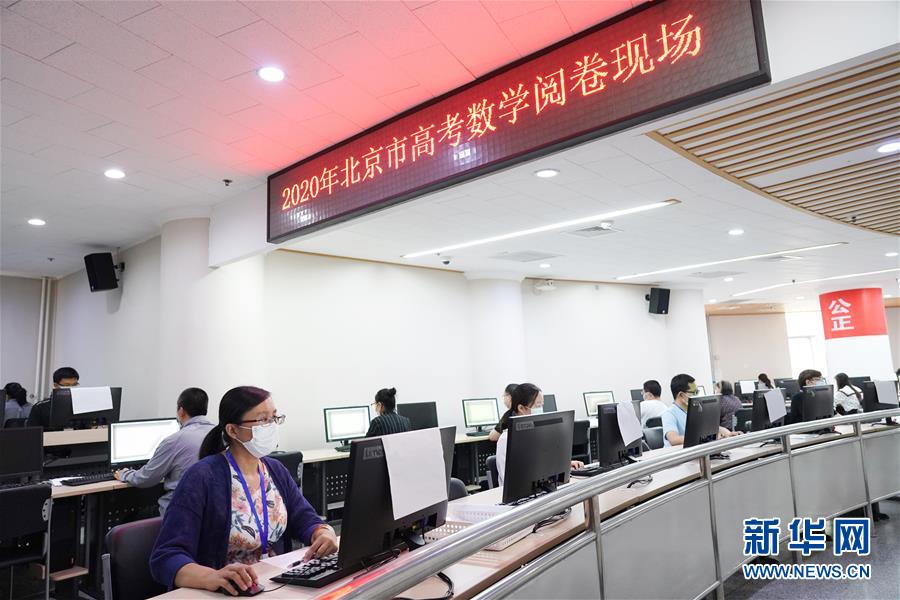 7月16日,評卷老師在位于清華大學的高考數學閱卷現場用計算機系統閱卷。 當日,北京市舉行2020年高考評卷工作媒體開放日。據介紹,北京市2020年高考評卷工作已于7月9日開始,預計24日結束。北京市共組織1290名教師,在北京大學、清華大學等六個評卷點對近35萬份答卷進行評閱??荚嚦煽儗⒂?月25日12時發布。 新華社記者 鞠煥宗 攝