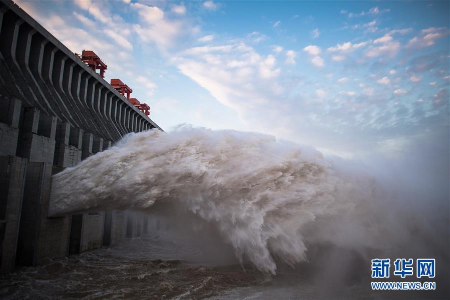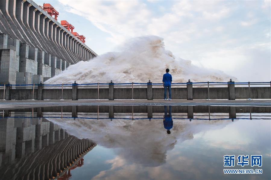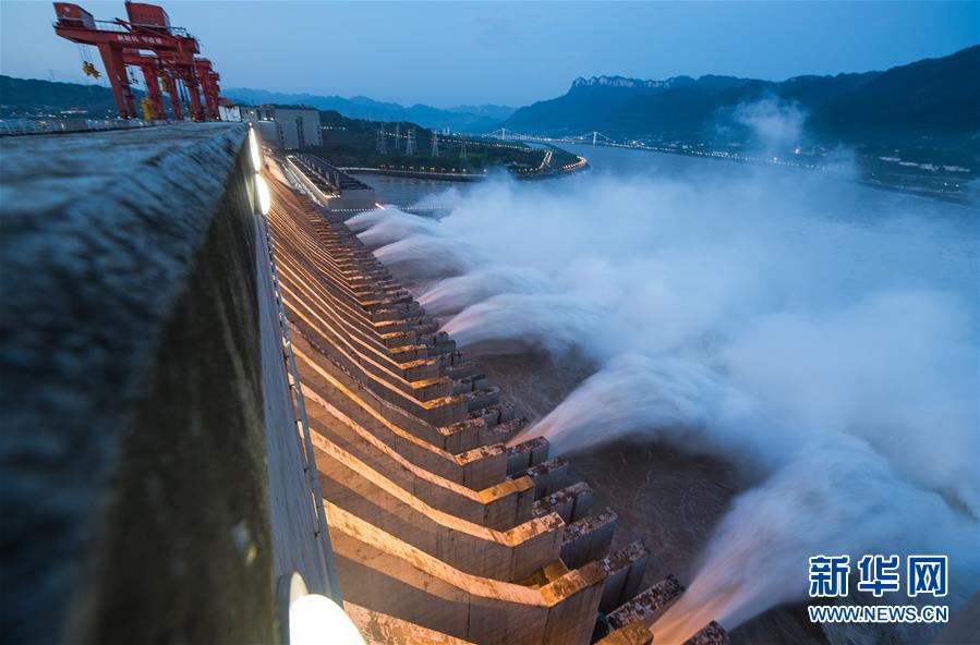 7月19日,三峽樞紐開啟泄洪深孔泄洪。 19日20時,三峽水庫入庫流量4.6萬立方米/秒,較本輪洪水的峰值6.1萬立方米/秒下降了1.5萬立方米/秒。“長江2020年第2號洪水”平穩通過三峽大壩。 新華社記者 肖藝九 攝