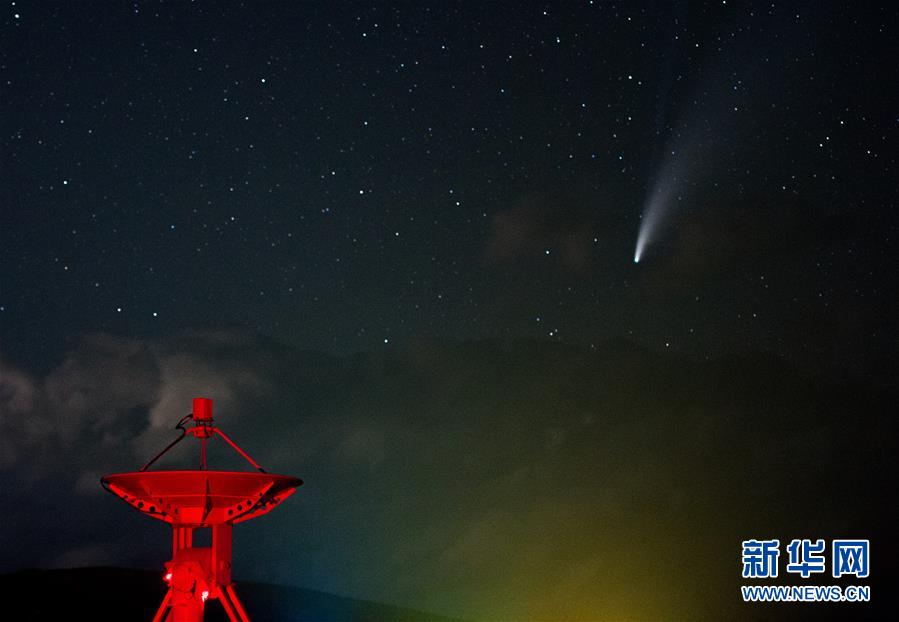 7月18日晚,在明安圖觀測基地,尼歐懷茲彗星劃過天際。 7月18日晚至19日凌晨,在位于內蒙古錫林郭勒盟正鑲白旗境內的國家天文臺明安圖觀測基地,尼歐懷茲彗星劃過天際。在明安圖觀測基地內,排列著100面白色的拋物面天線。這個龐大的天線陣列便是草原“天眼”——明安圖射電頻譜日像儀。草原“天眼”持續接收太陽射電輻射,然后由科研人員進行數據分析研究,對空間環境監測、太陽活動預報均有重要作用。 新華社記者 連振 攝