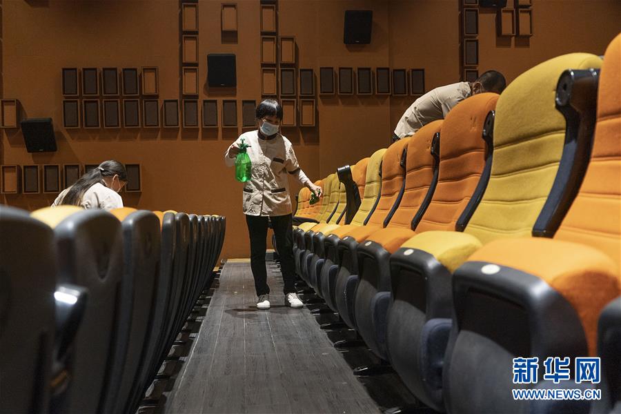 7月20日,一家影院的工作人員在觀眾散場(chǎng)后進(jìn)行消殺工作。 當(dāng)日,在各項(xiàng)疫情防控措施有效落實(shí)到位的前提下,武漢市部分電影院恢復(fù)開(kāi)放。 新華社記者 熊琦 攝