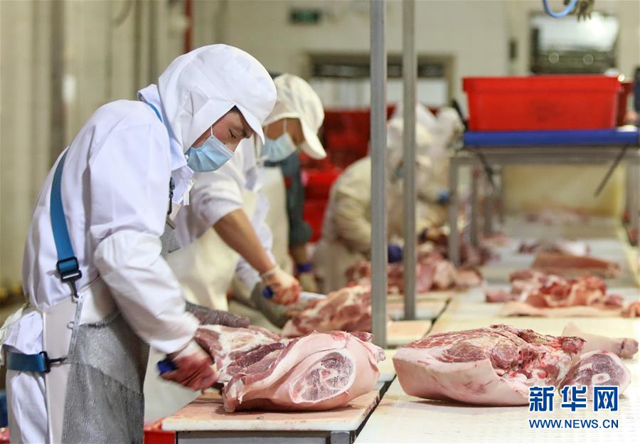 7月15日,北京二商肉類食品集團有限公司員工在肉類分割流水線上工作。 北京二商肉類食品集團有限公司是保障北京肉類市場供應的主要企業之一。新冠肺炎疫情以來,企業嚴格實施北京市、農業農村部和中國肉類協會的防疫要求,對進入廠區的人員、車輛以及原料采購、屠宰分割、產品加工、貯藏運輸、廢棄物收集及污水處理等生產環節嚴格防疫,強調源頭把關徹底消毒。目前,集團公司下屬多家生豬屠宰加工基地正常運營,保質保量供應北京市場需求。 新華社記者 李欣 攝