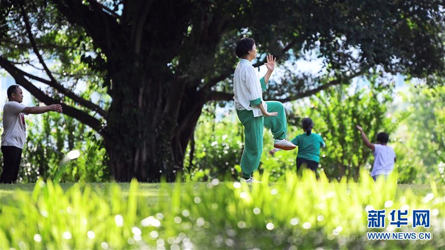 7月25日,市民在南湖公園晨練。廣西南寧市南湖公園內綠樹成蔭,天然氧吧的優美環境給三伏天晨練的市民們提供了一個良好的健身場所。新華社記者張愛林 攝